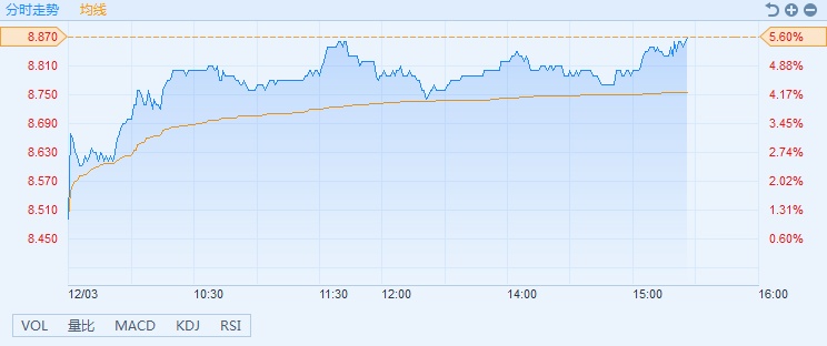 智通财经APP获悉,前10月发动机销量56.6万台同比增8.8%,潍柴动力(02338)股价造好,截至15时25分,涨5.6%,报价8.87港元,成交额1.35亿。