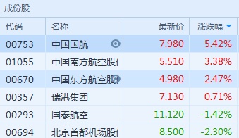 智通财经APP获悉,受益于在岸人民币收复6.9关口,航空股普涨,截至发稿,在岸人民币涨753点,报6.8852。截至15时45分,中国国航(00753)涨5.42%,报价7.98港元,南方航空(01055)涨3.38%,报5.51港元,东方航空(00670)涨2.47%,报4.98港元。