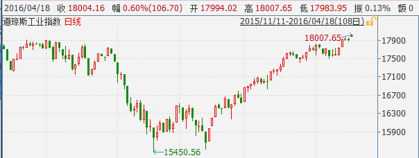 截至收盘,道琼斯工业平均指数收涨106.70点,涨幅0.60%,报18004.16点,为9个月以来首次涨至18000点关口上方;标普500指数收涨 13.61点,涨幅0.65%,报2094.34点;纳斯达克综合指数收涨21.80点,涨幅0.44%,报4960.02点。