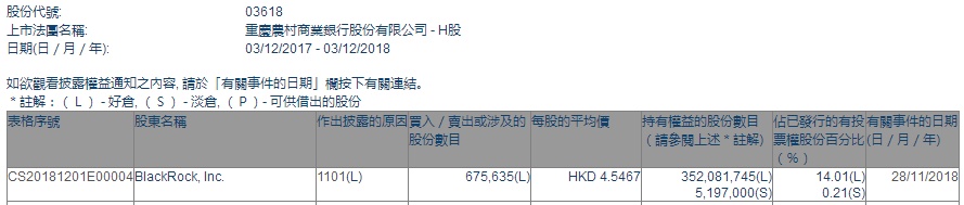 智通财经APP获悉,根据联交所资料显示,贝莱德于11月28日增持重庆农村商业银行(03618)67万股,每股作价4.55港元,总值约304.85万港元,最新持股数目约3.52亿股。
