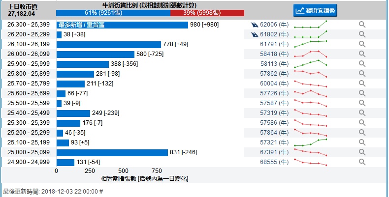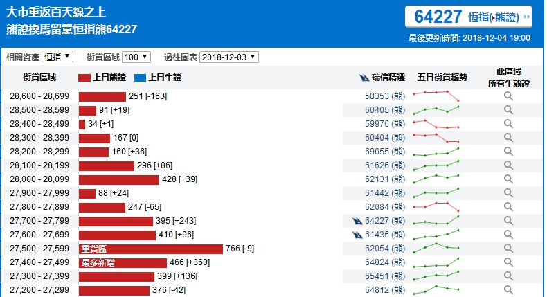 智通财经APP获悉,截至12月3日,恒指最新的牛熊街货比例61:39。从瑞信恒指牛熊证街货分布图中得到的数据显示,熊证街货重货区在27500-27599区间,该区间熊证数量为766张,比上一交易日减少9张;最多新增在同一区间。牛证中重货区在26300-26399区间,该区间最新牛证数量为980张,比上一交易日增加980张;最多新增在同一区间。