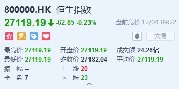 智通财经APP获悉,恒生指数开盘跌0.23%,报27119.19点。国企指数跌0.29%,报10850.08点。红筹指数跌0.3%,报4377.81点。大市盘前成交24.26亿港元。