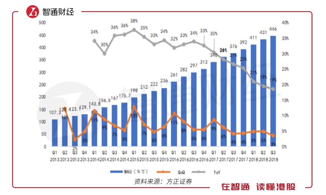 2018年第三季度,新浪微博的MAU(月用户活跃数)达4.46亿,同比增长19%,环比增长3%,移动端MAU占比维持在93%,18Q3微博的DAU(日用户活跃量)达到1.95亿。