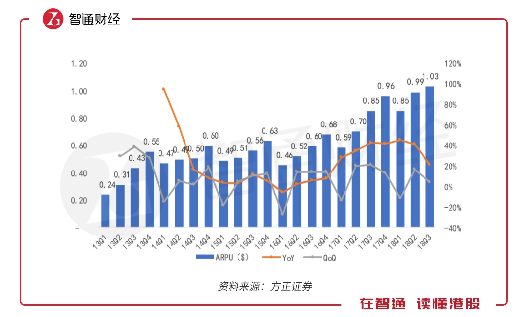 微博的APRU(每用户月平均收入)在2014年到2016年这三年期间停滞不前,从2017年2月份开始迅速增长。智通财经APP认为未来APRU不太可能再大幅增长。