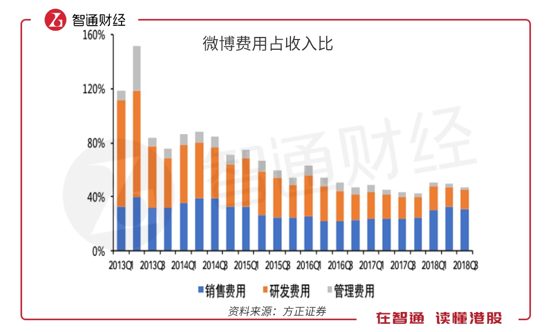 微博在18Q3的营销费用、管理费用和研发费用合计2.18亿美元,同比增长56%,高于营收同比44%的增幅,环比增长4%,18Q3三项费用合计占营收的比重为47%,其中营销费用占比就达到31%,主要是渠道推广以及微博急速版推广费用的增加。