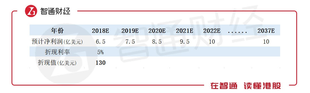 因为微博有护城河(尽管这个护城河不如BAT宽阔),所以可以用自由现金流折现法(DCF法)进行估值,假设微博可以持续经营20年,由于微博是一个轻资产经营的企业,因此可以用净利润替代自由现金流进行估算,假设微博的利润从2018年的6.5亿美元增加到2022年的10亿美元,再假设2021年到2037年的净利润保持在10亿美金。