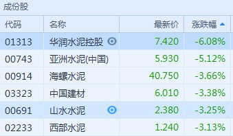 智通财经APP获悉,水泥股全线下跌,华润水泥(01313)领跌板块,截至13时38分,华润水泥跌6.08%,报价7.42港元,亚洲水泥(00743)跌5.12%,报5.93港元,海螺水泥(00914)、中国建材(03323)及山水水泥(00691)均跌逾3%。