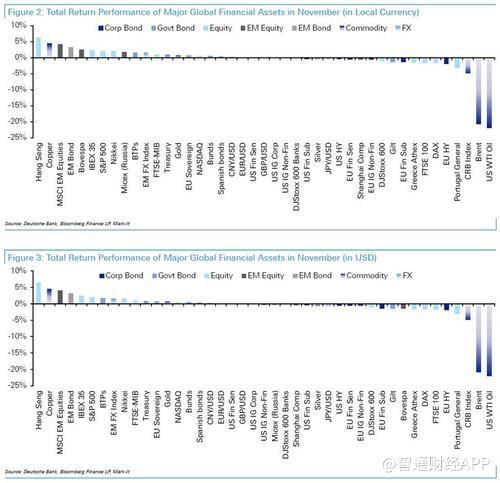 德意志银行分析师Craig Nicol表示,也许市场感觉不到月内资产波动较大,但与10月份相比,11月份的资产回报率相对平稳。事实上,整体情况喜忧参半,在德银追踪的资产类别中,11月,有15项(共38项)以美元计价的资产总回报率为正,17项以本币计价的资产总回报率为正。年初至今资产表现则较为黯淡,目前以本币计价的且总回报率为正的资产只有10种,而以美元计价的只有5种。