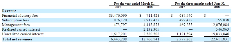 不过,基岩资本也在通过调整业务结构保持营收的增长。据招股书显示,截至2018年6月30日,基岩资本总共营业收入达2261.1万元美元(约合1.55亿元人民币),其中净收入为1020.9万元美金(近7006万元人民币)。