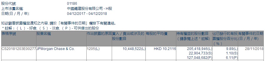 智通财经APP获悉,根据联交所资料显示,摩根大通于11月28日减持中国铁建(01186)1044万股,每股作价10.21港元,总值约1.066亿港元,最新持股数目约2.05亿股。