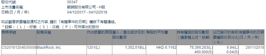 智通财经APP获悉,根据联交所资料显示,贝莱德于11月29日减持鞍钢股份(00347)135万股,每股作价6.12港元,总值约826.2万港元,最新持股数目7,536万股。
