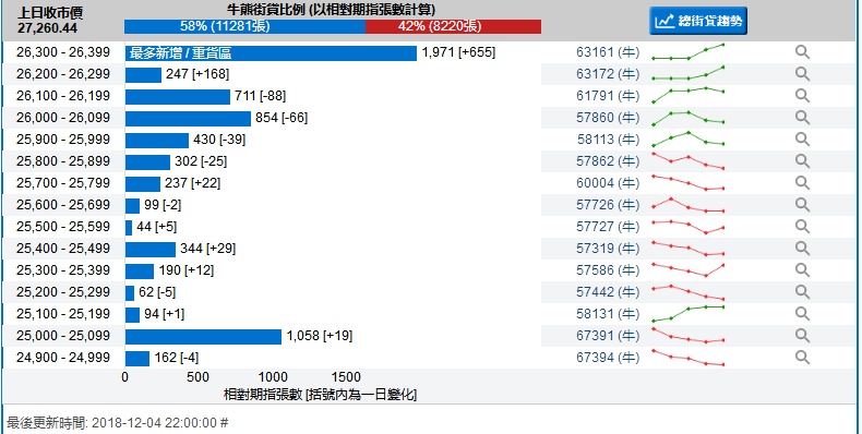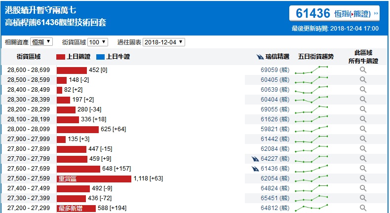 智通财经APP获悉,截至12月4日,恒指最新的牛熊街货比例58:42。从瑞信恒指牛熊证街货分布图中得到的数据显示,熊证街货重货区在27500-27599区间,该区间熊证数量为1118张,比上一交易日增加63张;最多新增在27200-27299区间。牛证中重货区在26300-26399区间,该区间最新牛证数量为1971张,比上一交易日增加655张;最多新增在同一区间。