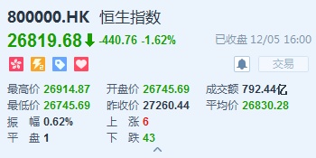 智通财经APP获悉,恒指早盘低开514.75点或1.89%,报26745.69点。截至收盘,恒生指数跌440.76点或1.62%,报26819.68点,全日成交额达792.44亿。国企指数跌1.38%,报10756.95点,红筹指数跌1.14%,报4359.65点。近日美债收益率曲线开始有倒挂的迹象,被市场人士视为美国经济衰退的先兆。隔夜美股道指暴跌近800点,恐慌袭击全球市场。