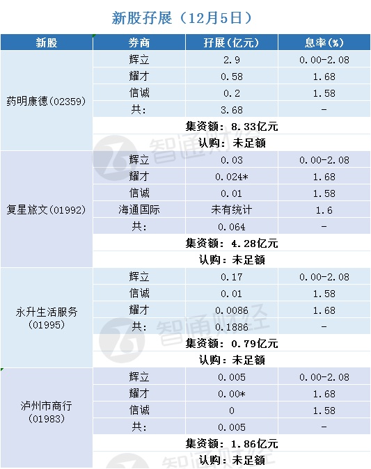 智通财经APP获悉,药明康德(02359)、复星旅文(01992)、永升生活服务(01995)、泸州市商行(01983) 正在招股中。截至12月5日,辉立、耀才、信诚等多家券商为他们分别借出3.68亿、0.064亿、0.1886亿及0.005亿孖展金。