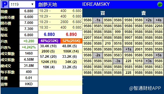智通财经APP获悉,创梦天地(01119)将于12月6日挂牌,上市前夕,据辉立交易场资料显示,暗盘收报6.88港元,较招股价6.6港元,涨0.28港元或4.242%。成交量458万股,成交额为3180万港元。每手400股,不计手续费,每手赚112港元。