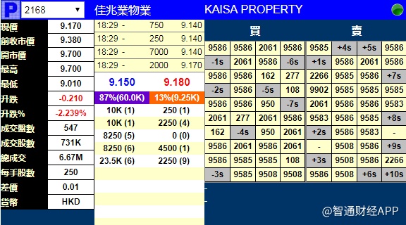 智通财经APP获悉,佳兆业物业(02168)将于12月6日挂牌,上市前夕,据辉立交易场资料显示,暗盘收报9.17港元,较招股价9.38港元,跌0.21港元或2.239%。成交量7310股,成交额为667万港元。每手250股,不计手续费,每手亏52.5港元。