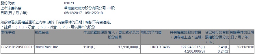 智通财经APP获悉,根据联交所资料显示,贝莱德于11月30日增持华电国际电力股份(01071)1391万股,每股作价3.35港元,总值约4659.85万港元,最新持股数目约1.27亿股。