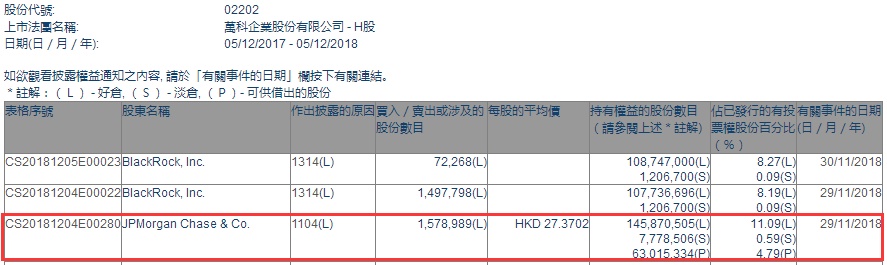 智通财经APP获悉,根据联交所资料显示,摩根大通于11月29日增持万科企业(02202)157万股,每股作价27.37港元,总值约4297.09万港元,最新持股数目约2.18亿股。