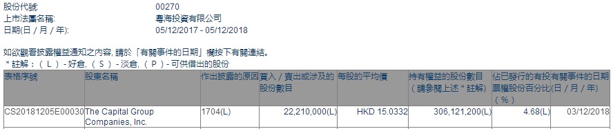 智通财经APP获悉,根据联交所资料显示,The Capital Group于12月3日减持粤海投资(00270)2221万股,每股作价15.03港元,总值约3.338亿港元,最新持股数目约3.06亿股。