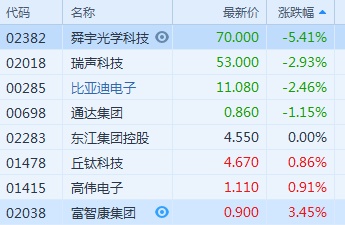 智通财经APP获悉,华为供应商早盘普跌,截至9时20分,舜宇(02382)跌5.41%,报价70港元,瑞声科技(02018)跌2.93%,报53港元,比亚迪电子(00285)跌2.46%,丘钛科技(01478)跌0.86%。