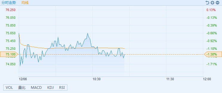 截至10时55分,中移动(00941)跌1.38%,报75.1港元,成交额达5.22亿。