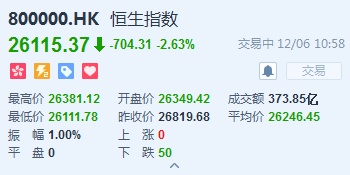 智通财经APP获悉,恒生指数早盘低开470.26点或1.75%,报26349.42点。截至10时58分,跌704.31点或2.63%,报价26115.37点,成交额373.85亿。