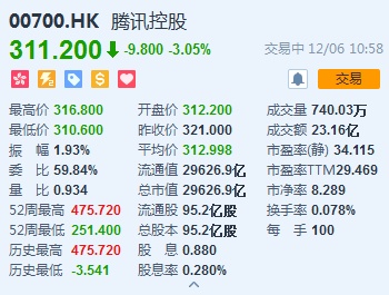 腾讯(00700)股价持续走弱,截至10时58分,跌3.05%,报311.2港元,拖累指数81点,成交额达23.16亿。