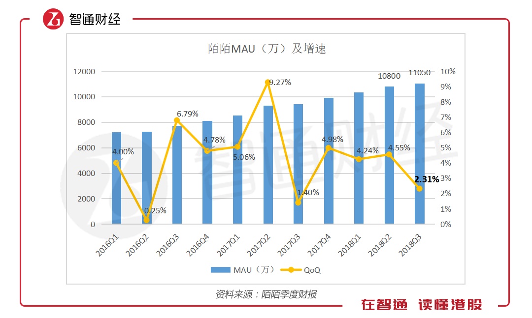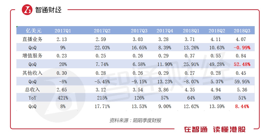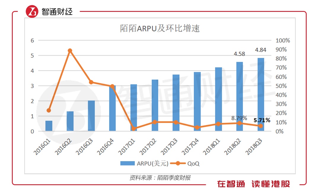 我们再来看收入指标,陌陌在第3Q18的营业收入为5.36亿美元,同比增长51%,环比增长8.44%,增速保持稳定。