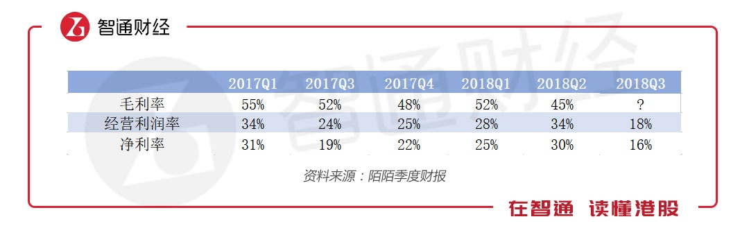 最后来看陌陌的利润指标,陌陌在3Q18的净利润为0.852亿美元,同比增长7.7%,3Q18的净利率为16%,经营净利率为18%,较二季度有所下滑。