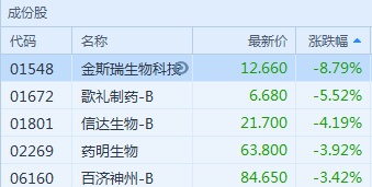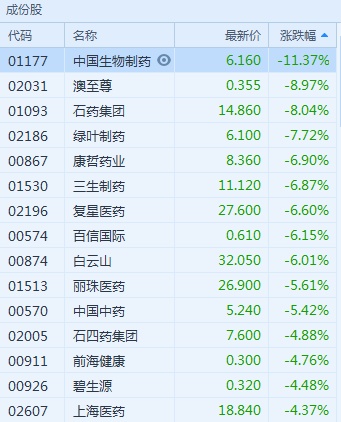 智通财经APP获悉,市场传国家带量采购价格大幅下降,医药股全线下挫。截至13时35分,中生制药(01177)跌11.37%,报价6.16港元,三生制药(01530)跌6.87%,报11.12港元,白云山(00874)跌6.01%,石四药(02005)跌4.88%,金斯瑞(01548)跌8.79%,歌礼制药(01672)跌5.52%。