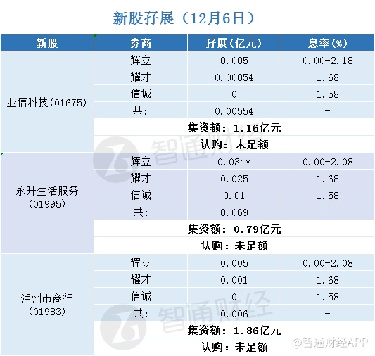 智通财经APP获悉,亚信科技(01675)、永升生活服务(01995)、泸州市商行(01983)正在招股中。截至12月6日,辉立、耀才、信诚等多家券商为他们分别借出0.00554亿、0.069亿及0.006亿孖展金。