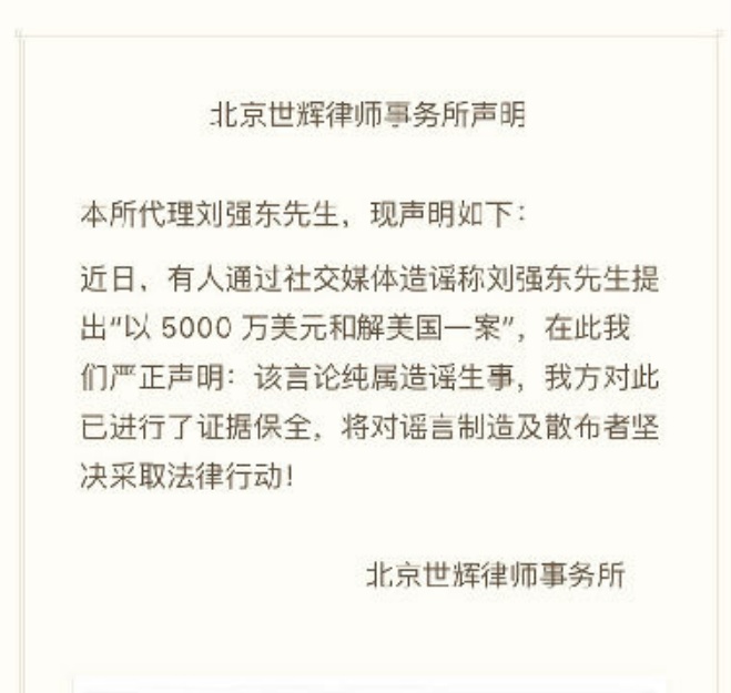 智通财经APP获悉,关于近日有传闻称刘强东“以5000万美元和解美国一案”,刘强东代理律所北京世辉律师事务所发布声明称:“该言论纯属造谣生事,我方对此已进行了证据保全,将对谣言制造及散布者坚决采取法律行动。”