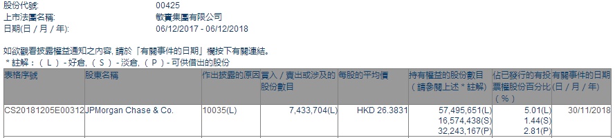 智通财经APP获悉,根据联交所资料显示,摩根大通于11月30日增持敏实集团(00425)743万股,每股作价26.38港元,总值约1.96亿港元,最新持股数目5749万股。