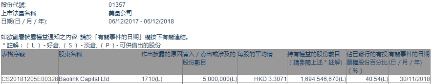 智通财经APP获悉,根据联交所资料显示,Baolink Capital Ltd于11月30日增持美图公司(01357)500万股,每股作价3.31港元,总值约1655万港元,最新持股数目约16.94亿股。