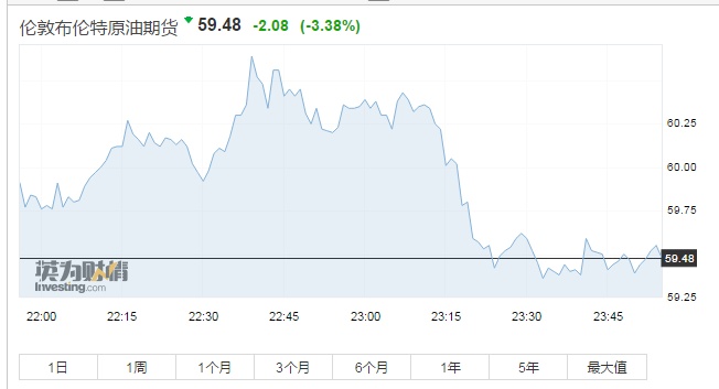 布伦特原油期货报59.48美元/桶,跌3.38%。