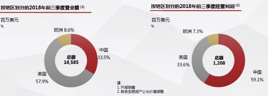 从营业额分地区结构来看,2018年前三季度,美国业务占比达到57.9%,中国业务占比33.5%,欧洲业务占比8.6%;从经营利润分地区贡献来看,中国经营利润占比59.1%,美国占比33.6%,欧洲占比7.3%。