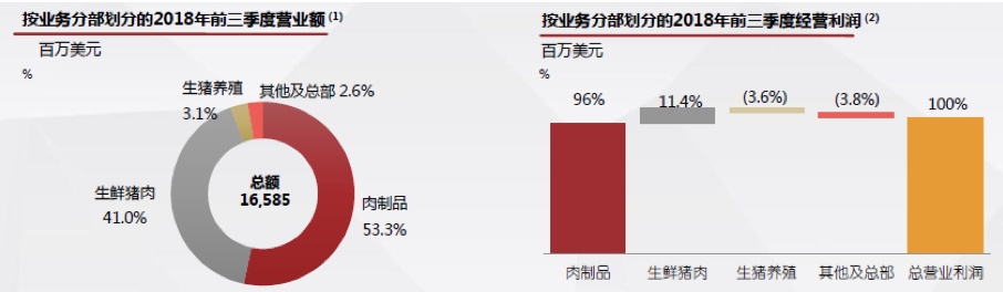 从业务分部来看,肉制品贡献了绝大部分的经营利润,2018年前三季度肉制品收入贡献53.3%,经营利润贡献96%。生猪养殖尚处于亏损阶段。