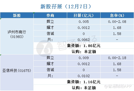 智通财经APP获悉,泸州市商行(01983)、亚信科技(01675)正在招股中。截至12月7日,辉立、耀才、信诚等多家券商为他们分别借出0.0062亿及0.0102亿孖展金。