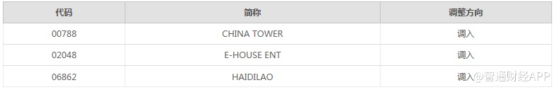 将中国铁塔(00788)、易居企业控股(02048)、海底捞(06862)调入港股通,并自下一港股通交易日起生效。