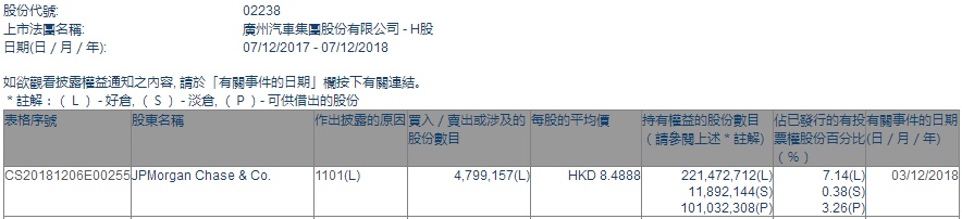 智通财经APP获悉,根据联交所资料显示,摩根大通于12月3日增持广汽集团(02238)479万股,每股作价8.49港元,总值约4066.71万港元,最新持股数目约2.21亿股。