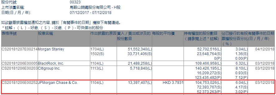 智通财经APP获悉,根据联交所资料显示,摩根大通于12月3日增持马鞍山钢铁股份(00323)1339万股,每股作价3.79港元,总值约5074.81万港元,最新持股数目约1.04亿股。