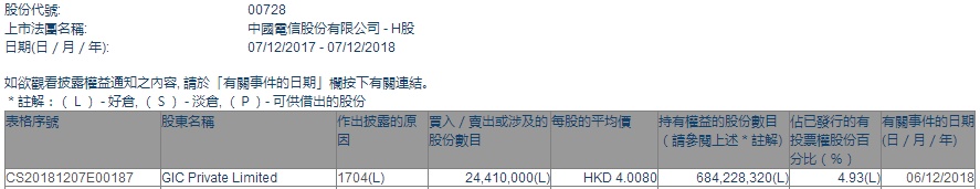 智通财经APP获悉,根据联交所资料显示,GIC Private Ltd于12月6日减持中国电信(00728)2441万股,每股作价4.0港元,总值约9464万港元,最新持股数目约6.84亿股。