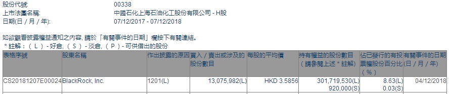 智通财经APP获悉,根据联交所资料显示,贝莱德于12月4日减持上海石油化工(00338)1307万股,每股作价3.59港元,总值约4962.13万港元,最新持股数目约3.01亿股。