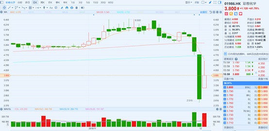 可是彩客化学却高兴不起来,在别人都高开高走的情况下,自家不但低开,还一路下跌,开盘20分钟,便发布了临时停牌暂停买卖的公告。此时股价近乎腰斩,下跌45.75%收至2.68港元,市值蒸发近24亿港元。