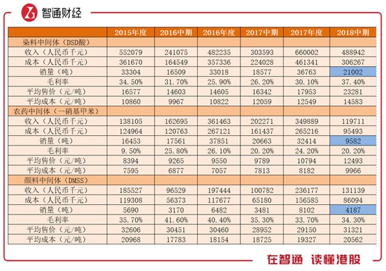 秉持谨慎的原则,智通财经APP整理了公司上市以来的各个产品的数据情况。从表中可以看到,总收益占比最高的染料中间体(DSD酸)毛利率经历了先下降后上升的过程,其它两种则比较稳定,但农药中间体毛利率较低在20%-25%之间,而颜料中间体毛利率则在35%-40%范围波动。