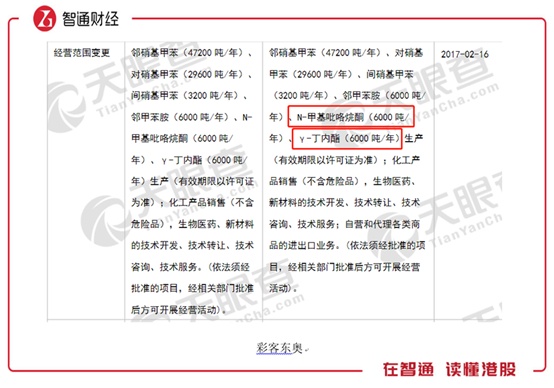 根据官网和公开信息显示,江苏淮河产能确如回应文中产能达到53.38万吨(包括一硝基甲苯8万吨和邻家恶男2万吨),而彩客东奥出现了偏差。根据天眼查数据,除了回应文中一硝基甲苯8万吨和邻甲苯胺6000吨以外,还有N-甲基吡咯烷酮和γ-丁内酯产能各6000吨,因此总产能为9.8万吨,而非该公司披露的8.6万吨。