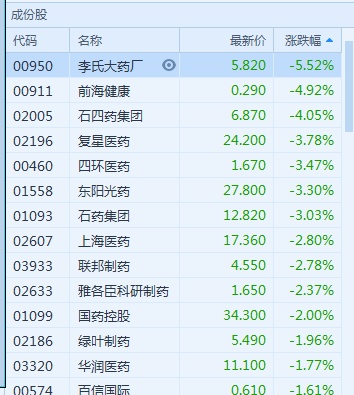 其他医药股方面,截至发稿,李氏大药房(00950)跌5.52%,石四药(02005)跌4.05%。