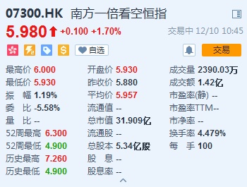 此外,恒指反向杠杆产品,南方一倍看空恒指(07300)涨1.7%,报5.98港元,成交额达1.42亿。
