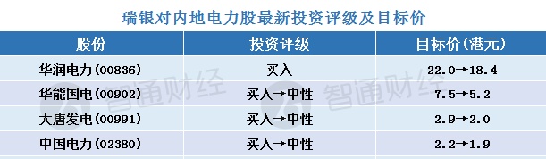 该行看好基本因素强劲的润电(00836),维持“买入”评级,下调华能国电(00902)、大唐发电(00991)及中国电力(02380)评级自“买入”降至“中性”,该行对电力股最新评级及目标价如下: