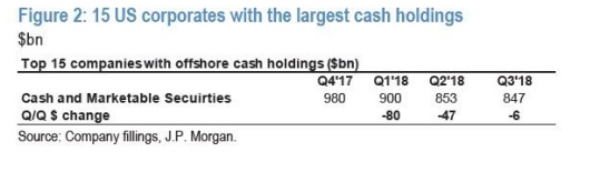 摩根大通预计在总汇回的4000亿里面大概有一半或1900亿的资金用于股票回购。大约900亿用于债务偿还。4000亿里还有大约450亿将在第4季度用于股票回购。这意味着只有大约750亿真正用于投资建设,直接刺激美国国内经济。这个数字远远低于特普朗政府的预期。